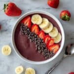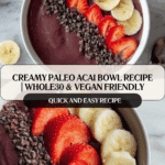 A refreshing and nutrient-packed Acai Bowl that is Paleo, Whole 30, and Vegan friendly. This recipe combines unsweetened acai puree with a blend of frozen berries, banana, and coconut milk to create a thick, creamy smoothie bowl. Topped with fresh strawberries, cacao nibs, and banana slices, it makes for a perfect healthy breakfast or snack packed with antioxidants and natural sweetness.