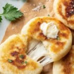 Arepas con Queso are delightful Venezuelan-style corn cakes filled with melted mozzarella cheese, featuring a crispy golden crust and a tender, cheesy interior. Made from pre-cooked white cornmeal and Cotija cheese, these stuffed arepas are cooked on the stovetop or an electric griddle, making them a perfect savory snack or light meal.