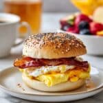 A delicious and hearty Bacon, Egg, and Cheese Bagel Breakfast Sandwich recipe featuring baked bacon and a smooth cottage cheese egg bake, perfect for a satisfying morning meal or preparing ahead for the week.