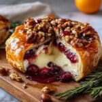 Keywords: Baked Brie, Cranberries, Walnuts, Puff Pastry, Holiday Appetizer, Festive Snack, Cheese Appetizer, Holiday Recipe