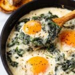 - Add Eggs: Create four wells in the spinach mixture and carefully crack one egg into each well. Season the eggs lightly with salt and pepper.