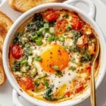 This Baked Feta Eggs recipe combines juicy cherry tomatoes, sweet bell pepper, and fresh spinach with creamy feta cheese and perfectly baked eggs. Seasoned with oregano, thyme, red pepper flakes, and garlic, it’s a savory, nutrient-packed breakfast or brunch dish that’s easy to prepare and visually stunning when served in ramekins or a baking dish. Serve it warm with crusty bread for a delightful meal.