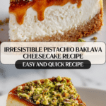 This Baklava Pistachio Cheesecake is a decadent fusion dessert combining the rich, creamy texture of cheesecake with the sweet, nutty flavors of traditional baklava. Featuring a buttery pistachio crust, a luscious cream cheese filling, and a crisp, honey-soaked filo topping, this recipe delivers a unique and impressive treat perfect for special occasions.