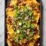 - Add Fresh Toppings and Serve: Remove the nachos from the oven carefully. Immediately sprinkle the chopped cilantro, diced red onion, and sliced jalapeno evenly over the top. Serve hot and enjoy your elevated game day feast!