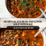 A hearty and nutritious Black Bean and Lentil Soup featuring a blend of sautéed vegetables, spices, and leafy kale, simmered to perfection and finished with a splash of lemon juice for brightness. This comforting soup is packed with plant-based protein and fiber, making it perfect for a wholesome meal.