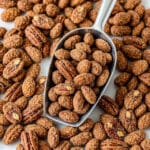 Store the cooled candied pecans and almonds in an airtight container at room temperature for up to two weeks. Keep them away from heat and moisture to maintain their crispness. To refresh the crunch, you can reheat them in a 300˚F oven for 5–7 minutes before serving.