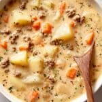 Keywords: Cheeseburger Soup, bacon soup, ground beef soup, creamy potato soup, comfort food soup, easy soup recipe