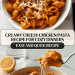 This cheesy chicken pasta is the ultimate comfort meal, combining tender chicken and perfectly cooked pasta shells in a rich, creamy tomato sauce. It’s easy to make, customizable, and perfect for a cozy dinner or a relaxed lunch. Serve it hot with a sprinkle of cheese and parsley for that extra touch.
