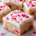These Chewy Valentine Sugar Cookie Bars offer the nostalgic flavor of classic sugar cookies in an easy-to-make, thick, soft bar form. No rolling or cutting needed—just bake in an 8×8 pan and top with a festive pink glaze and Valentine sprinkles for a perfect treat to share during the holiday.