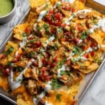 Keywords: Chicken Shawarma, Nachos, Middle Eastern, Appetizer, Oven-roasted Chicken, Tahini Sauce, Salsa, Feta Cheese, Game Night Snack, Family Dinner