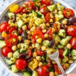 - Add Veggies: In a large bowl, add 2 cups diced cucumber, 1½ cups halved cherry tomatoes, ½ cup halved Kalamata olives, ⅓ cup chopped shallot, ¾ cup corn, and ⅓ cup finely chopped parsley. Pour the marinated chickpeas and dressing over the vegetables. Toss gently to combine all ingredients evenly.