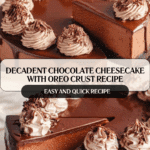 This decadent chocolate cheesecake features a rich Oreo cookie crust, a smooth and creamy chocolate cheesecake filling enhanced with espresso powder, and a luscious chocolate ganache topping. Finished with chocolate whipped cream rosettes, this indulgent dessert is perfect for special occasions or satisfying any chocolate lover’s craving.