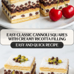 Keywords: Cannoli squares, ricotta dessert, chocolate chip dessert, baked cannoli, Italian dessert, easy dessert recipe