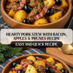 This Cozy Pork Stew with Bacon, Apples, and Prunes combines tender braised pork shoulder with crispy bacon, sweet apples, and rich prunes, all simmered in a flavorful cider and mustard-infused broth. Perfect for a comforting and hearty meal, this stew offers a delightful balance of savory and sweet flavors with a thick, luscious sauce.
