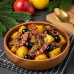 This cozy pork stew combines tender pork shoulder with the smoky richness of bacon, the sweetness of apples, and the deep flavor of prunes. Slow-simmered in a blend of cider and mustard, it’s a hearty dish perfect for chilly evenings and sharing with family and friends.