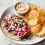 - Serve: Warm the tortillas and serve the shredded beef with desired toppings such as cilantro lime sauce, avocado sauce, pickled onions, and crumbled feta. Enjoy your flavorful tacos!