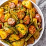 A comforting and flavorful slow cooker recipe featuring andouille sausage, baby potatoes, green beans, and a savory dry onion soup mix, all cooked to tender perfection and topped with melting butter for rich taste.