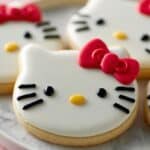 These Cute Hello Kitty Sugar Cookies are a fun and easy baking project perfect for kids and parties. Made using a sugar cookie mix and simple decorating supplies, these adorable cat-shaped treats feature vanilla frosting, black licorice whiskers, yellow candy sprinkle noses, and Hello Kitty fruit snack bows. They bake quickly, require no special equipment, and are great for last-minute celebrations or weekend activities with children.