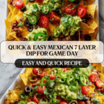 This Mexican 7 Layer Dip is a vibrant and flavorful appetizer perfect for game day or casual gatherings. With layers of seasoned beans, creamy guacamole, tangy ranch dip, cheese, and fresh vegetables, it’s sure to be a crowd-pleaser. Plus, it comes together quickly in just 10 minutes.