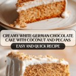 This Delightful White German Chocolate Cake with Coconut Bliss is a luscious, layered dessert featuring moist white chocolate-infused cake layers and a rich cream cheese frosting blended with shredded coconut and chopped pecans. Perfect for celebrations, this cake combines the sweetness of white chocolate and the tropical touch of coconut, finished with a nutty crunch for a balanced texture and flavor.
