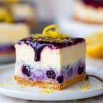 - Finish and Serve: Once the cake has cooled, spread the mascarpone lemon buttercream evenly over the top. Drizzle the cooled blueberry sauce generously over the frosting. Slice and serve.