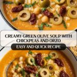 This vibrant Green Olive Soup is a savory, hearty blend of fresh herbs, sundried tomatoes, chickpeas, and tender orzo simmered in a rich vegetable stock. Highlighted by the unique addition of green olives and creamy coconut cream, this Mediterranean-inspired soup is both comforting and packed with flavor. Perfect as a nutritious lunch or light dinner, it balances plant-based ingredients with fragrant herbs and a hint of tanginess from the olives.