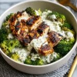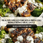 Keywords: grilled chicken bowl, broccoli bowl, creamy garlic sauce, healthy grain bowl, meal prep bowl, high protein dinner, gluten free dinner, nutritious bowl recipe