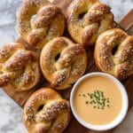 Homemade Soft Pretzels recipe with a golden crust and soft, chewy interior. This classic snack is made from simple ingredients and baked to perfection, with a quick baking soda bath to achieve that iconic chewy texture. Perfect for serving with cheese dip or your favorite toppings.
