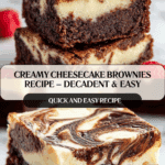Indulgent Cheesecake Brownies blend rich, fudgy chocolate brownies with a creamy, tangy cheesecake swirl. These decadent treats offer the perfect balance of dense chocolate and smooth cream cheese, baked to perfection in an 8×8-inch pan. Ideal as a dessert or a special snack, they are simple to prepare and sure to impress.