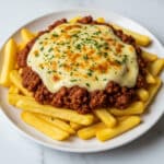 - Assemble Fries and Chili: Once the fries are crispy and ready, transfer them to a serving platter. Pour the cheesy chili sauce evenly over the fries, ensuring good coverage.