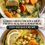 This Lemony Greek Chickpea Soup is a bright, tangy, and protein-packed Mediterranean-inspired dish ideal for summer lunches or light dinners. Featuring tender chickpeas, fresh vegetables, and a refreshing zing of lemon, it’s healthy, vegan-friendly, and full of vibrant flavor. Perfect for meal prep or cozy family dinners, this soup combines simple ingredients for a nourishing and satisfying bowl of goodness.