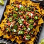 - Garnish and serve: Top the warm nachos with pickled jalapeños, extra cilantro, a squeeze of fresh lime juice, and any optional toppings such as vegan crema, avocado, pico de gallo, or crunchy radishes before serving.