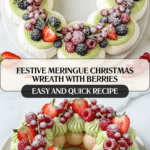 This Meringue Christmas Wreath is a festive and elegant dessert perfect for holiday celebrations. Crisp, airy meringue circles are topped with a creamy green mascarpone whipped cream and decorated with vibrant fresh fruits and rosemary for a stunning centerpiece.