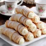 Mom’s Cream Horns are a delightful, flaky pastry filled with a creamy frosting made from either heavy whipping cream or Cool Whip combined with cream cheese and powdered sugar. These classic treats feature golden puff pastry spirals baked to perfection and filled with a luscious, smooth cream, perfect for serving at parties or as a sweet indulgence.