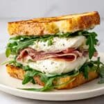 A delicious and easy-to-make Mozzarella Prosciutto Sandwich featuring toasted crusty bread, thinly sliced prosciutto, fresh mozzarella, and peppery arugula, finished with a drizzle of olive oil and optional balsamic vinegar for a perfect blend of flavors.