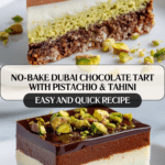 This No-bake Dubai Chocolate Tart combines a rich, crunchy graham cracker and cocoa crust with a buttery, toasted kataifi and pistachio cream filling, topped with a smooth milk chocolate ganache. It’s a decadent yet effortless dessert that requires no baking, perfect for impressing guests or treating yourself with a luxurious Middle Eastern-inspired chocolate tart.