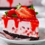 Keywords: No bake cheesecake, strawberry cheesecake, Oreo crust, easy cheesecake, chilled dessert, mascarpone cheesecake