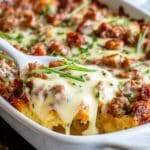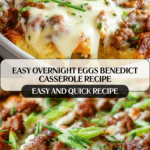 This Overnight Eggs Benedict Casserole is a delicious and hearty breakfast dish featuring layers of toasted English muffins, savory Canadian bacon, and sharp white cheddar cheese baked in a seasoned egg custard. Topped with a rich homemade hollandaise sauce and garnished with fresh herbs, this casserole is perfect for a make-ahead brunch that serves a crowd.
