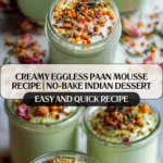 Paan Mousse is a unique and refreshing Indian fusion dessert that combines the earthy flavor of betel (paan) leaves with the floral sweetness of gulkand (rose petal preserve). This eggless, no-bake mousse is light, aromatic, and topped with tutti frutti and candied fennel for a colorful festive finish. Ideal for celebrations like Diwali and weddings, it’s easy to prepare ahead and serves beautifully in individual portions.