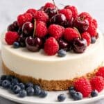 - Serve and garnish: Before serving, optionally garnish the cheesecake with fresh berries or your favorite fruit topping for added flavor and visual appeal.
