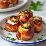 Pig Shots are a delicious appetizer featuring smoked sausage chunks wrapped in crispy bacon, topped with a creamy jalapeno-cheddar cheese mixture and brushed with a sweet and tangy honey BBQ glaze. Baked until golden and bubbly, these flavorful bites are perfect for parties and gatherings.