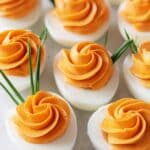 These Pumpkin Deviled Eggs are a festive and flavorful twist on a classic appetizer, perfect for fall gatherings or Halloween parties. Bright orange filling and a fresh chive “stem” make these eggs look like mini pumpkins, adding charm to any table.