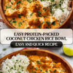 This Quick Protein Coconut Chicken Rice Bowl is a delicious, creamy meal featuring tender chicken pieces simmered in a fragrant coconut milk sauce with garlic and ginger. It’s a perfect weeknight dinner that comes together in under 30 minutes, offering comforting flavors and plenty of protein.
