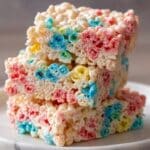 Store the Rainbow Rice Krispie Treats in an airtight container at room temperature for up to 3 days. To keep them fresh longer, you can refrigerate for up to a week, but allow them to come to room temperature before serving for the best texture. These treats are not recommended for freezing as they may become soggy upon thawing.