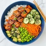 - Assemble the bowl: Arrange cooked rice or quinoa at the base of the bowl. Decoratively place the prepared cucumber, carrot, avocado, and edamame around the bowl. Top with cooked salmon pieces, drizzle with optional sriracha aioli or reserved marinade sauce, and sprinkle with sesame seeds or green onions if desired.
