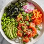 This vibrant Salmon Poke Bowl combines tender sushi-grade salmon marinated in a savory sesame-soy dressing with perfectly cooked sushi rice and an array of fresh, crunchy vegetables. Topped with nutty sesame seeds and green onions, this dish is a refreshing, nutritious, and easy-to-make meal that brings the flavors of Hawaii to your table.