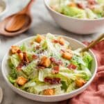 - Mix in toppings and serve: Add the freshly grated Parmesan, diced cooked bacon, and croutons to the bowl. Toss gently to blend all ingredients uniformly. Serve immediately, optionally adding extra Parmesan on top for added flavor.