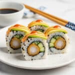 - Serve: Arrange shrimp tempura rolls on a serving plate, drizzle with optional sriracha mayonnaise and serve with soy sauce, pickled ginger, and wasabi on the side.