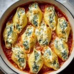 These Spinach and Ricotta Stuffed Shells are a comforting Italian-American baked pasta dish featuring jumbo pasta shells filled with a creamy mixture of ricotta, mozzarella, Parmesan, sautéed spinach, and garlic, all baked in a rich marinara sauce and topped with melted cheese. Perfect for a family dinner, this recipe is simple to prepare and delivers a deliciously cheesy and flavorful meal.