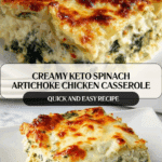 This Spinach Artichoke Chicken Casserole is a creamy, cheesy keto-friendly dish that’s perfect for a comforting dinner. Loaded with chicken, spinach, and artichokes, it combines rich flavors and satisfying textures in every bite.